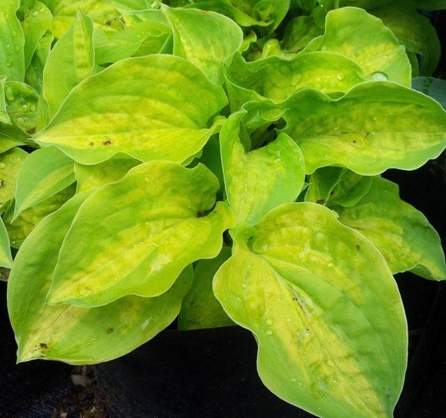 Gold Standard![]() | Быстро разрастается, крупная. Золотой лист с тонкой зеленой каймой. Невероятно красива в тенистых местах, зеленый кант становится синим, а центр глубоким желтым. На солнечных местах желтый цвет выгорает до белого. | ||||