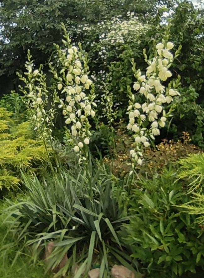 | Юкка нитчатая | Кочка жестких листьев около 0,6 м высоты, а цветоносы могут подняться вверх на 1,8 метра. | ||||