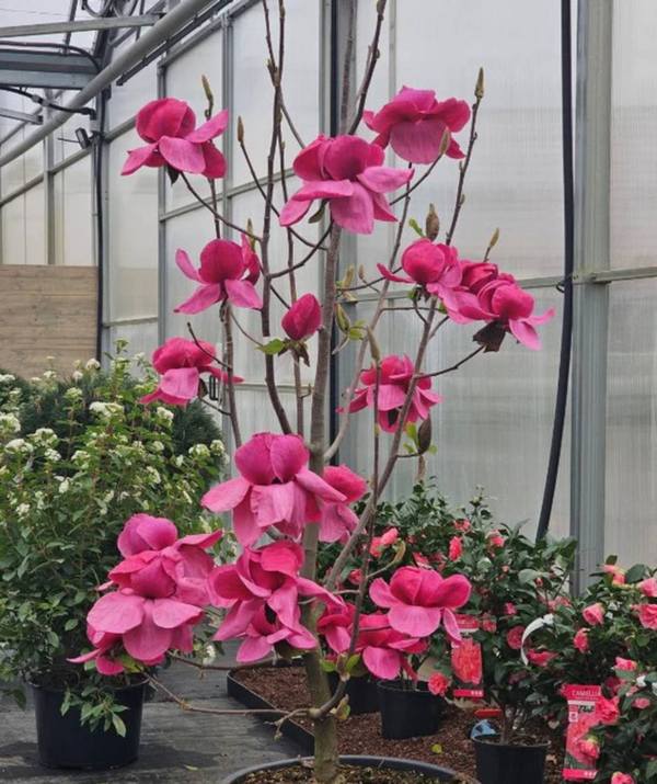 | Магнолия | Galaxy | Дерево c формой узкой пирамиды. Растёт медленно, после 10-ти лет высота 2-3 м. Цветки слегка ароматные, диаметром около 20 см, снаружи светло-красно-пурпурные, внутри более бледные розовые, с 12 лепестками. | 50,6-0,7 | ||