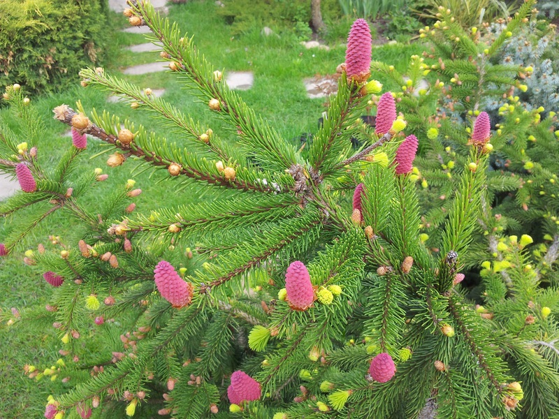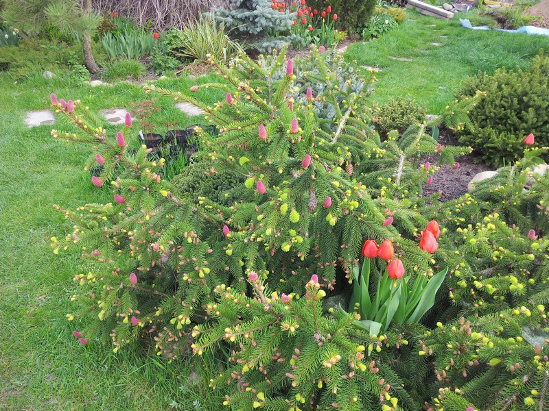 Медленнорастущая, неправильной формы, к 10 годам 1 м высоты и 2 м в диаметре, ветки расположены ярусами, постепенно набирает высоту. Весной яркие красные шишки на концах побегов даже на молодых растениях. Солнце, полутень.
