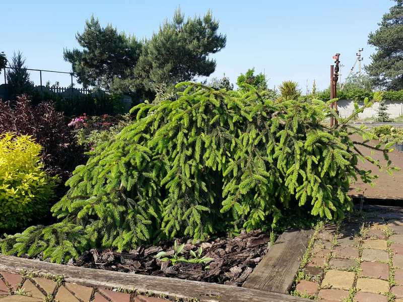 Плакучее деревце. Медленнорастущее, густая крона, не образует проводника. Хвоя короткая, сочно-зеленая. Солнце, полутень.