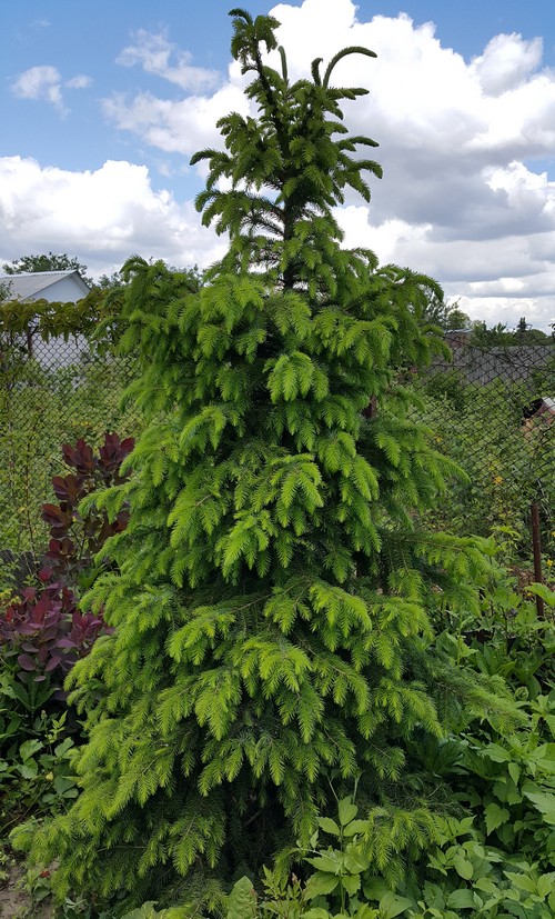 Самая быстрорастущая ель. Узкая, стройная крона. Иголка мягкая, двуцветная, сверху темно-зеленая, снизу бело-синяя. К 30 годам около 10м.