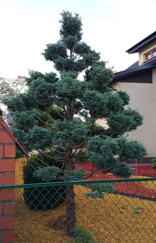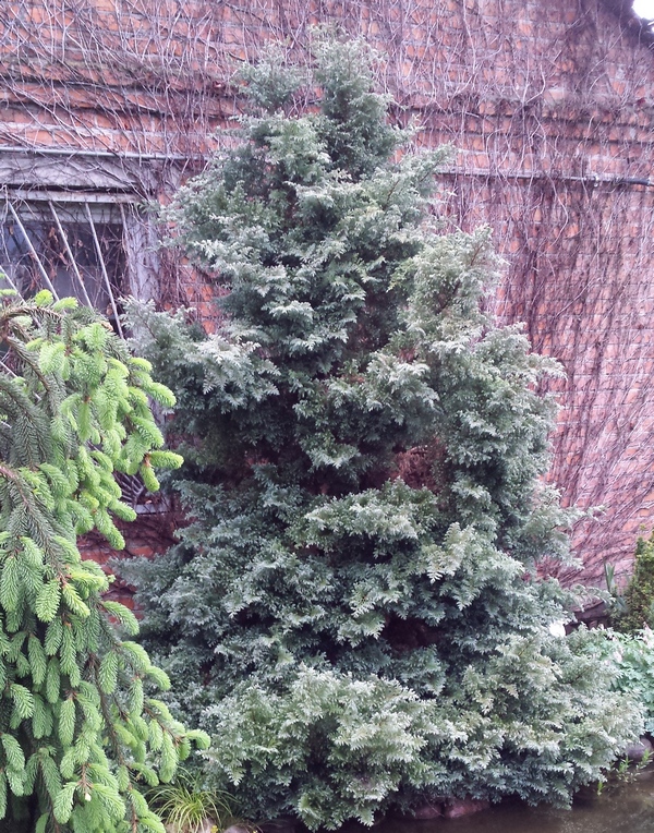 Средняя сила роста, к 10 годам 2 м высоты и почти столько же ширины. Хвоя нежная, приятная на ощупь, серебристо-голубого цвета. Любит полутенистые места, на ярком солнце может приобретать оливковый оттенок.