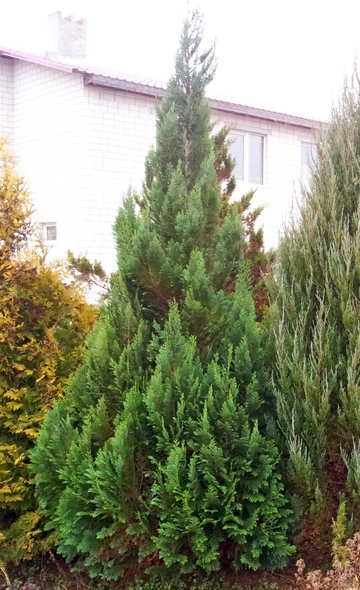 Быстро растущее дерево в форме колонны серо-голубого цвета. К 10 годам достигает 3 метра. Полутень, тень.