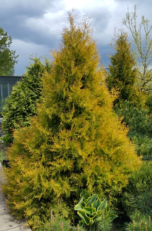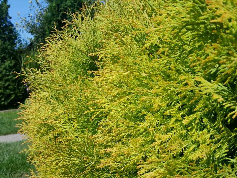 Округлый конус. Цвет очень яркий - желтый с ало-оранжевым приростом. Хвоя разная, мягкая игольчатая и пластинчатая. Растет медленно, набирая к 10 годам 1м высоты. Хорошо стрижется. Можно изобретать разные малые формы.