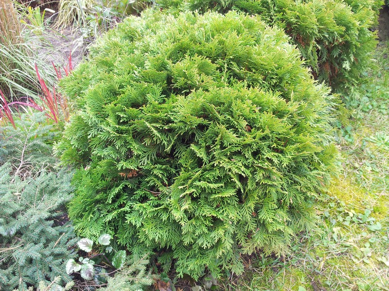 Карликовая, шаровидная туя яркого зеленого цвета. В 10 лет 0,4м диаметра.