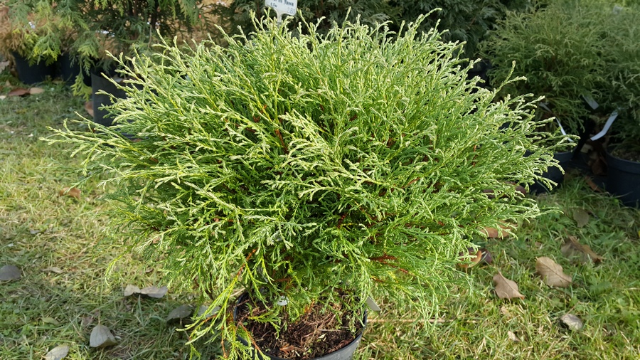 Приплюснутый, не большой шар зелено-голубого цвета. Хвоя не обычная, похожа на тонкие шнурки. Хорошо растет и устойчива к снегу.