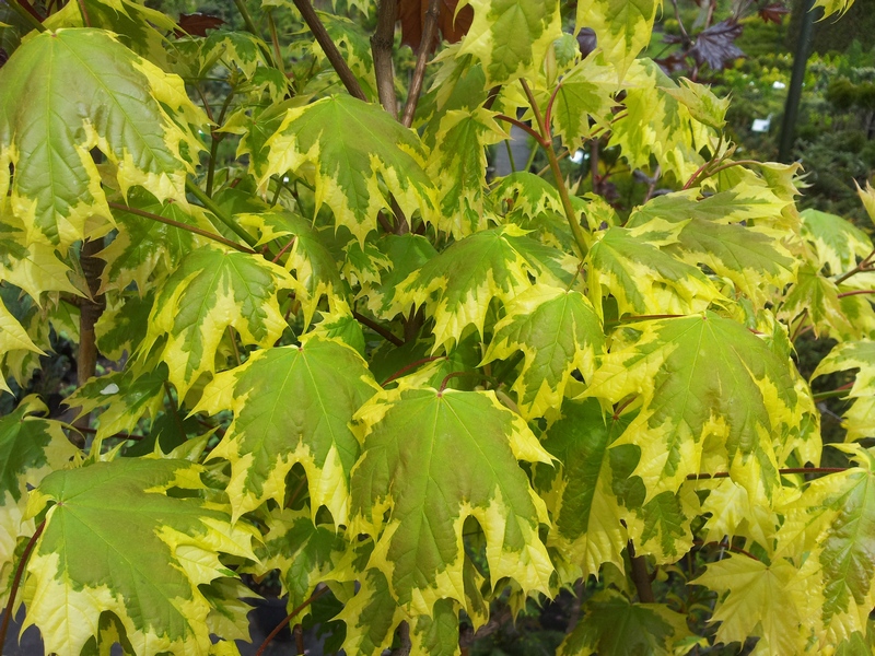 Клен остролистный | Drumondii | Не слишком большое дерево с очень светлой листвой. В роспуске они розовые, затем зеленые с широкой белой окантовкой. Растет медленно. | 25Ра-2,0+ | ||