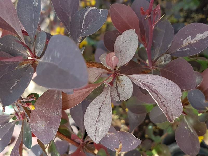 Барбарис оттавский | Silver Miles | Высокий, колючий куст с пурпурными листьями и серебристыми штрихами. Ягоды осенью бордового цвета, матовые. Очень стойкий. Дорастает до 3м. | 30,7 | ||