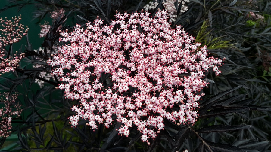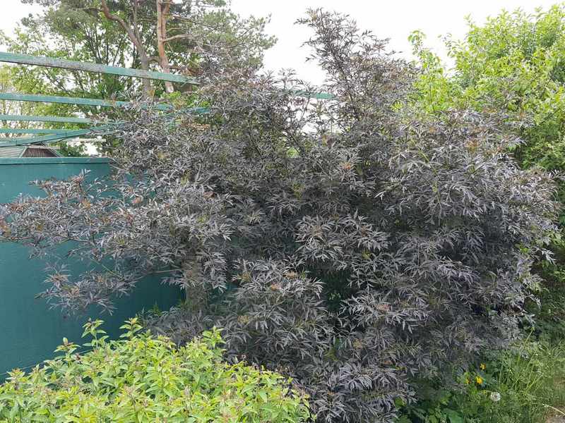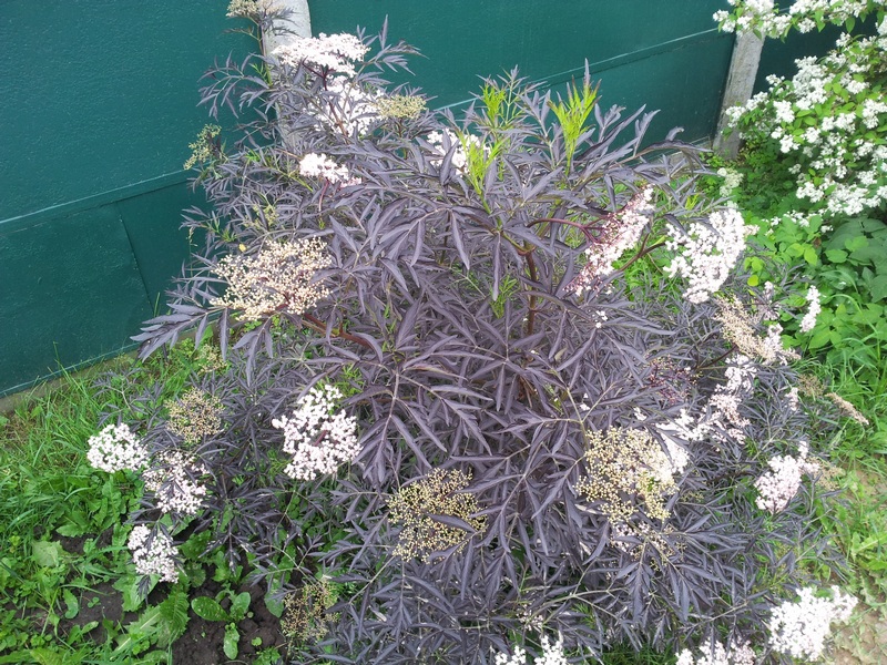 Крупный, очень красивый и ценный куст. Лист большой, разрезной, темного пурпурного цвета. Цветы в больших розовых шапках. Ягоды мелкие, черные, не ядовитые. Неприхотлив. Растет не быстро. Постепенно набирает 2м высоты.