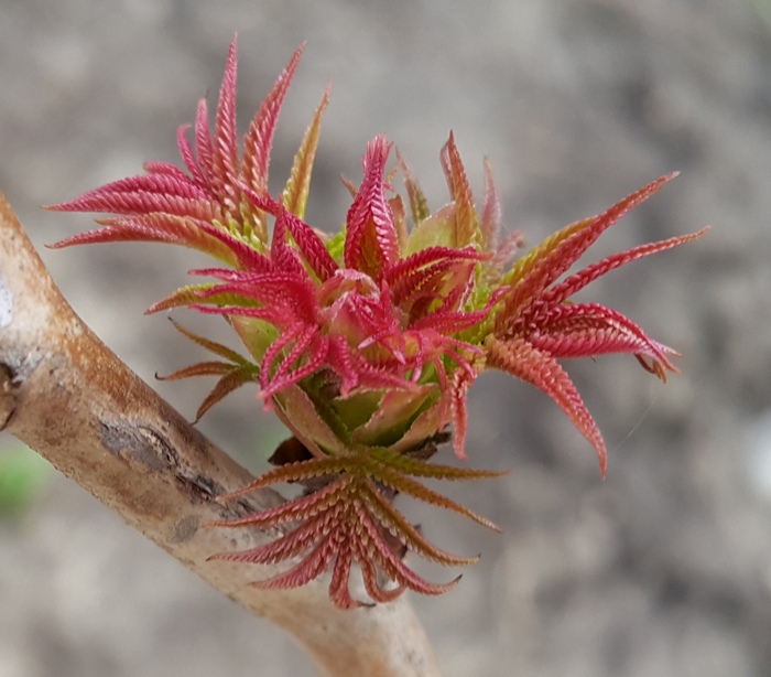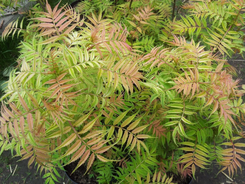 Яркий, метровый кустик. Лист сильно разрезной, желтый. прирост алого цвета. Цветы похожи на соцветия рябины, появляются в течении лета. Неприхотлив и морозостойкий.