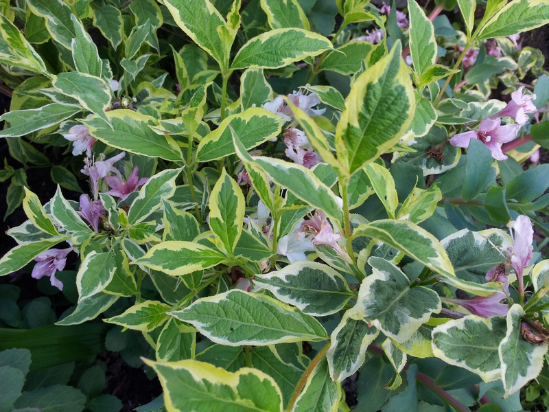 Постепенно набирает 1,3м высоты. Лист широкий, зеленый с необычной окантовкой - широкая желто-кремовая полоса с белыми вставками. Цветет обильно белыми и розовыми цветами.