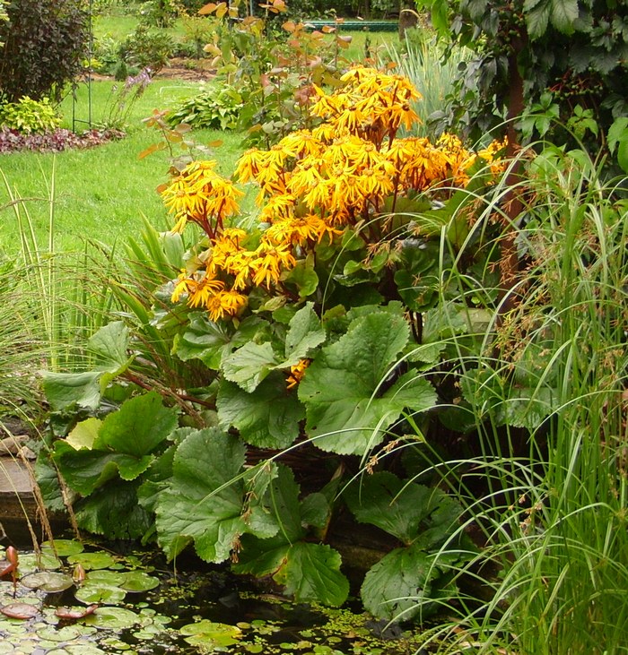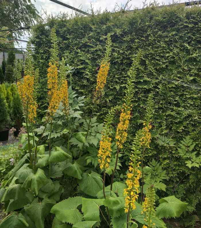 Бузульник узкоголовый | Зеленые листья с зубчатым краем на высоком черешке. Желтые цветы собраны в высокий цветонос до 1,5 м. Полутень и влажная почва. | ||||