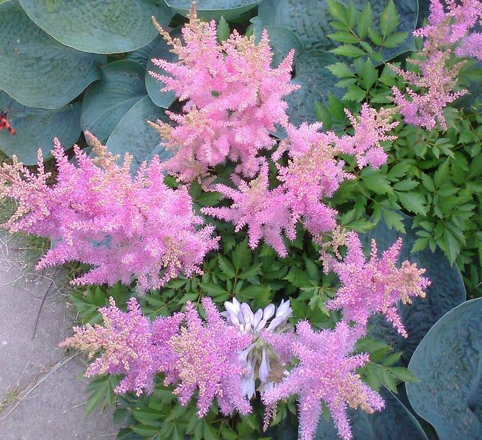 Пышное растение со сложными перистыми листьями, Цветки розово-сиреневые, собраны в метелки в июне-июле. Высота 70 см. Влажное место, полутень.