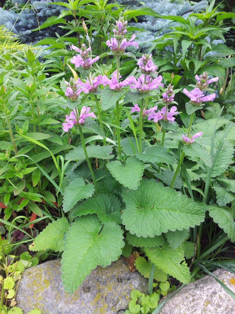 Встречается под названием буквица. Листья зеленые, рифленые, с обильным опушением. Цветет довольно долго яркими розово-лиловыми цветами, собранными в вертикальные соцветия. Хорошо растет в тени и на солнце. Надежное, засухоустойчивое.