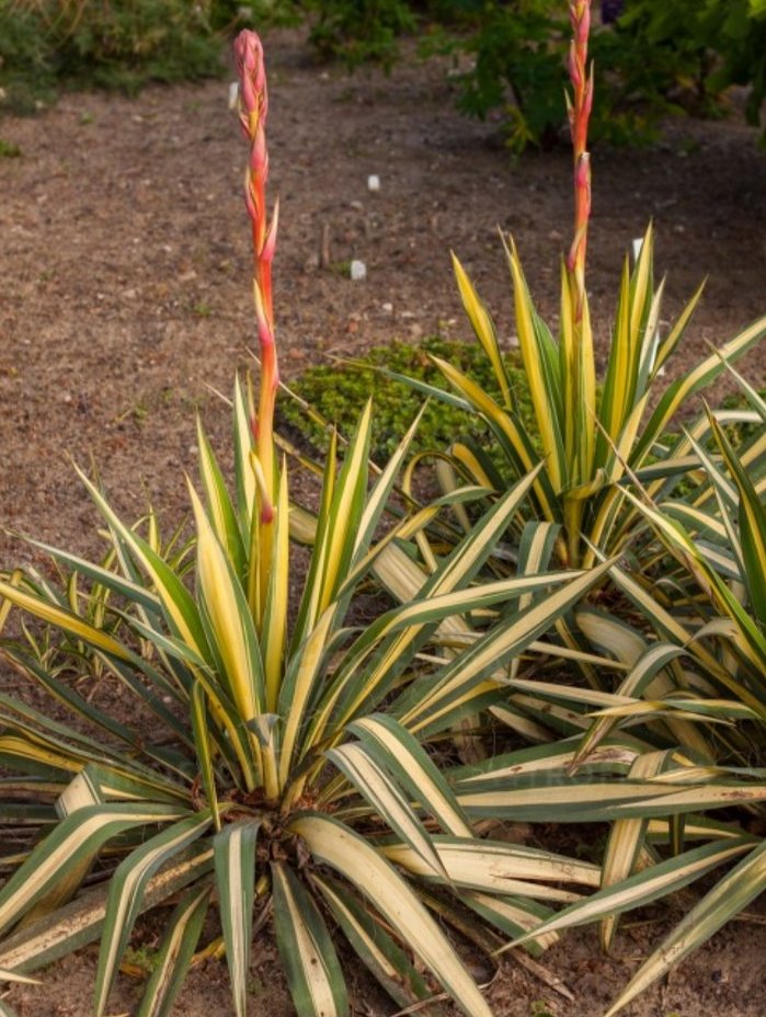 Листья жесткие, длинные, желтые с зеленой каймой. Осенью желтое поле окрашивается в алый цвет. Цветет летом. Полное солнце и сухая почва.